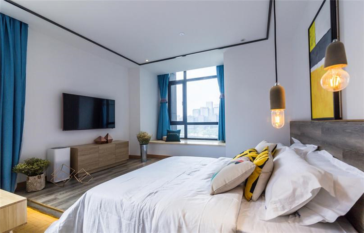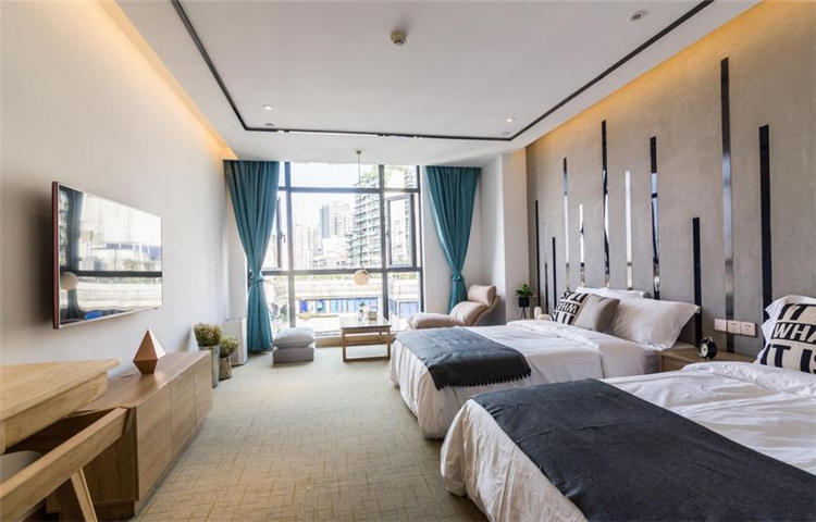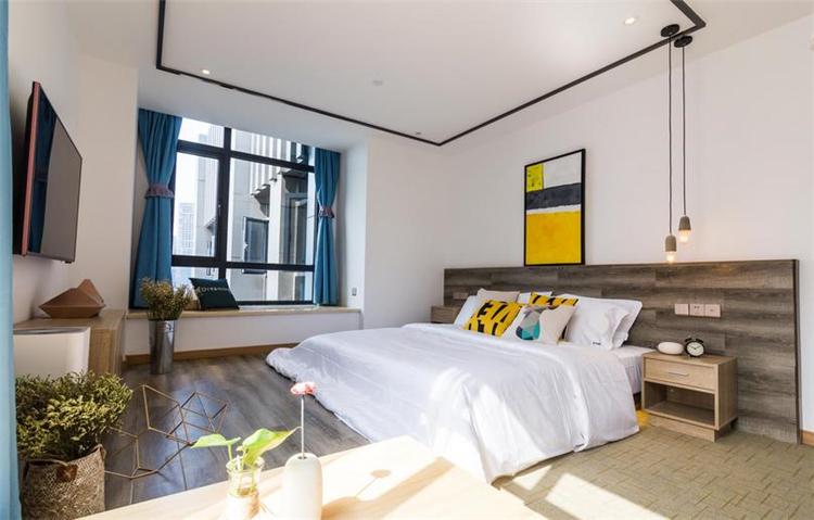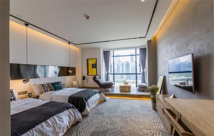 溫馨、小資、賓至如歸是本案設(shè)計的一條主線。大面積的墻體刷白,不做墻面大面積包裝,簡簡單單,讓空間更溫馨;配以部分水泥墻面做一個灰色系的穿插,讓空間在白的基礎(chǔ)上得以小范圍的格調(diào)提升,配上顏色稍微跳躍的畫及床品,視覺得以輕微的沖擊,不那么刺眼,更多的搭配原木木制品讓人更親近自然,讓客人感覺舒適,如歸家般放松。
